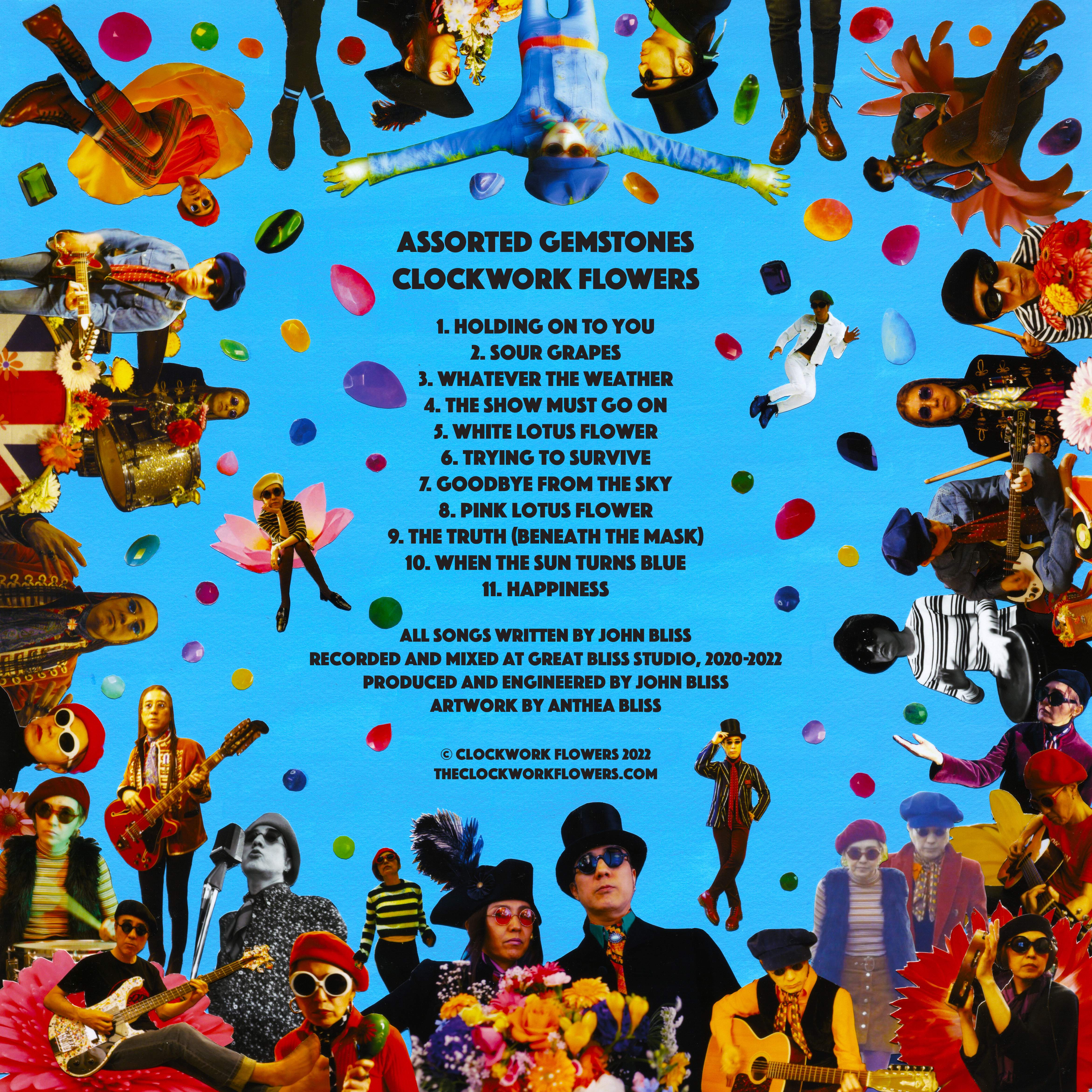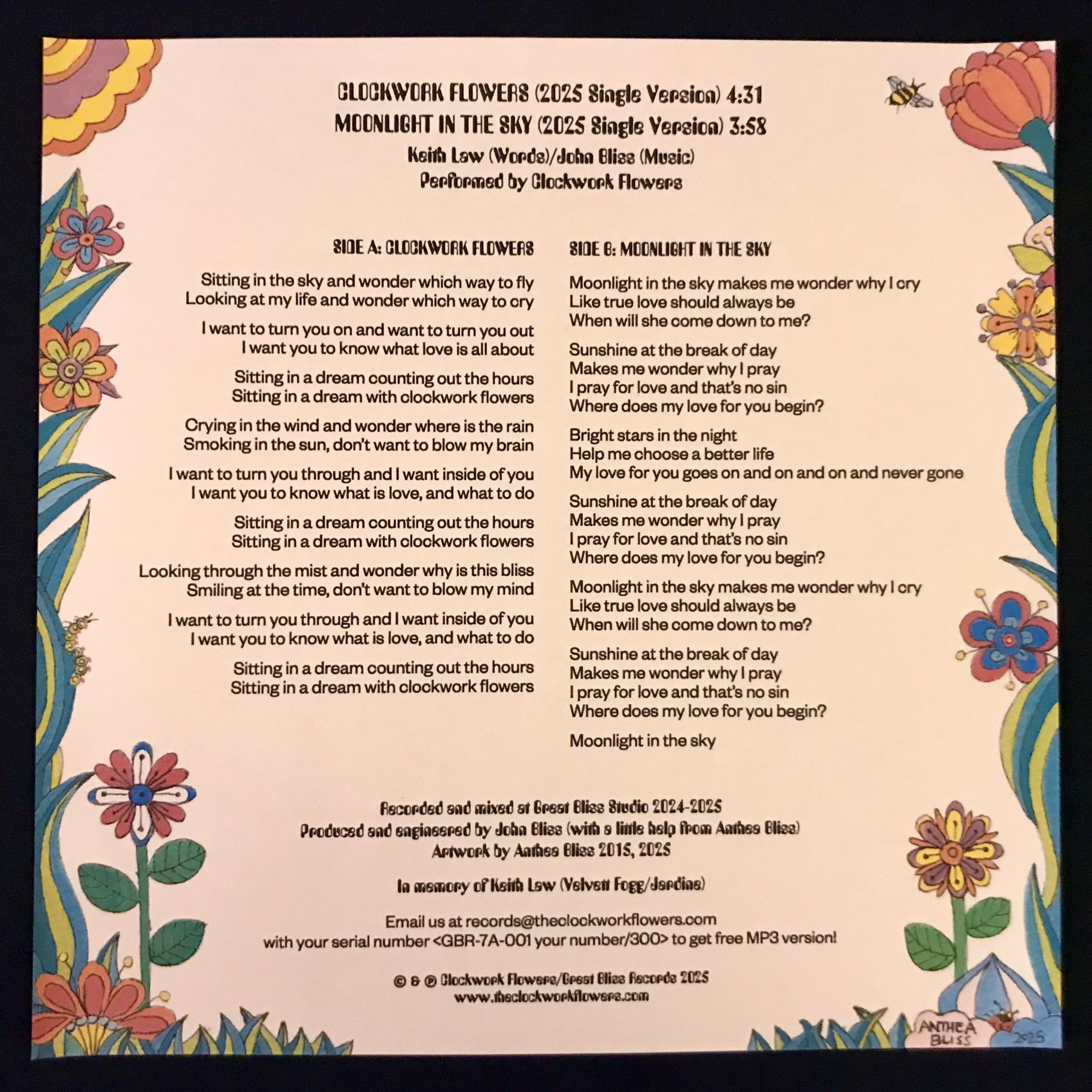 Lyric sheet for 'Clockwork Flowers 2025 Singles' 7" vinyl single (2025) Artwork by Anthea Bliss © Clockwork Flowers/Great Bliss Records 2025
